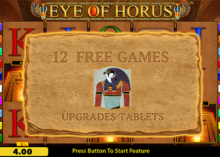 In the slot, Eye of Horus, you can trigger the free spin feature by landing three or more scatter symbols, awarding players with 12 free spins. If the Horus symbol, the wild symbol, hits the reel during the free spin rounds, all the other symbols that are in view, on the grid, will get upgraded to higher-paying ones.